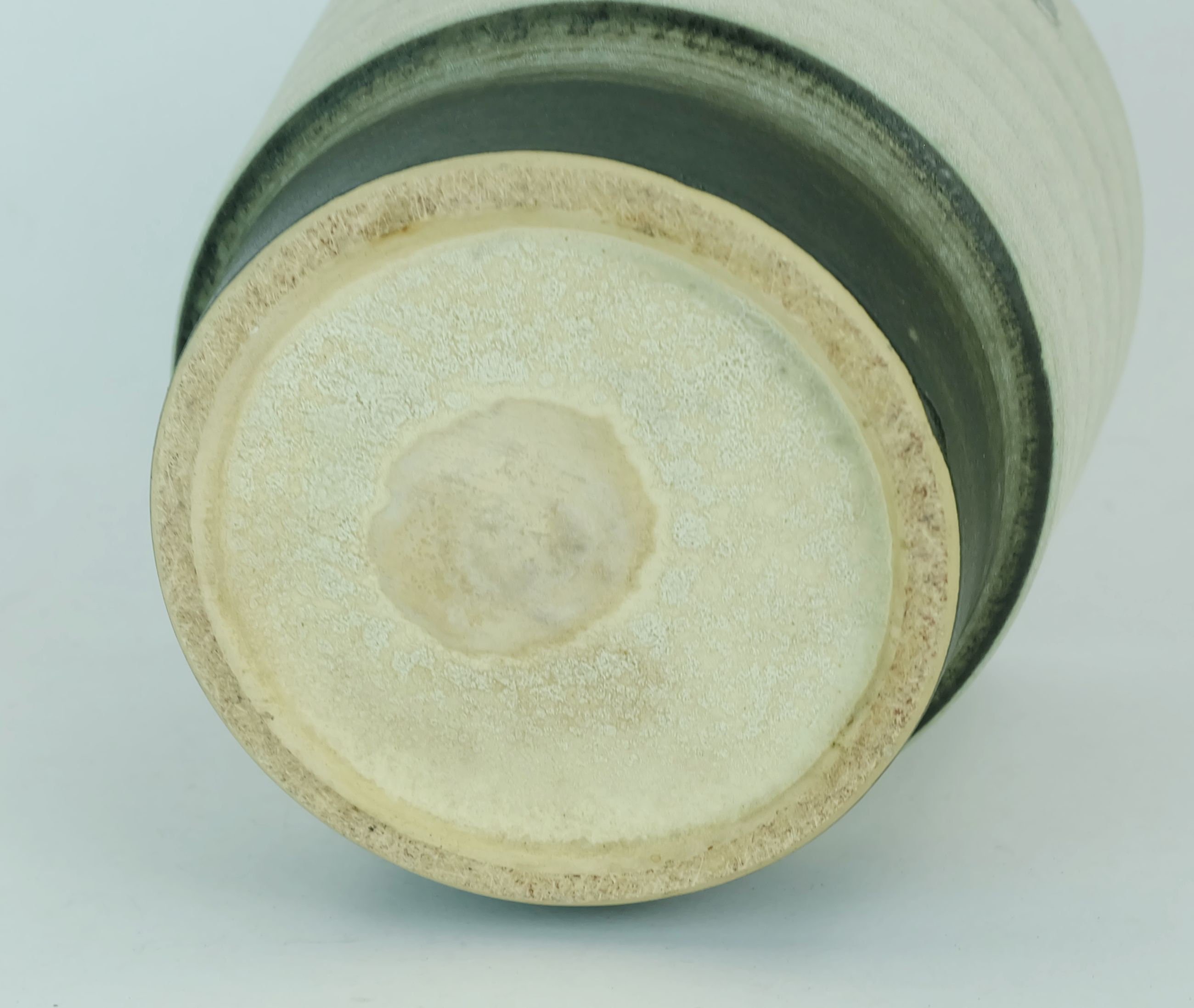 Large flowerpot manufactured by u-Keramik (ü-Keramik, Uebelacker) in the 1950s to 60s. Fine foamy glaze with stripe pattern in shades of gray, bottom and inside black glazed.